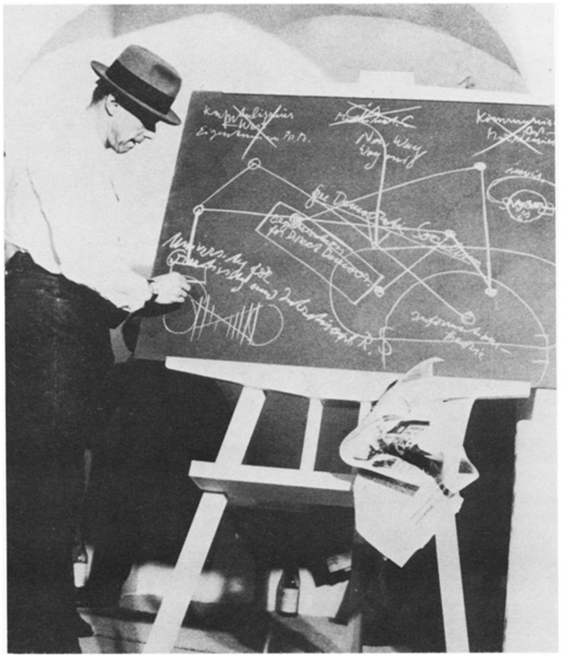 - Joseph Beuys. Conferência política, 1980. Galeria Lucrezia de Domizio, Pescara. Fotografia: Buby Durini. Fonte: MICHAUD, Éric. The ends of art according to Beuys. October, Cambridge: MIT Press, p. 36-46, p. 45, primavera de 1987, p. 45.